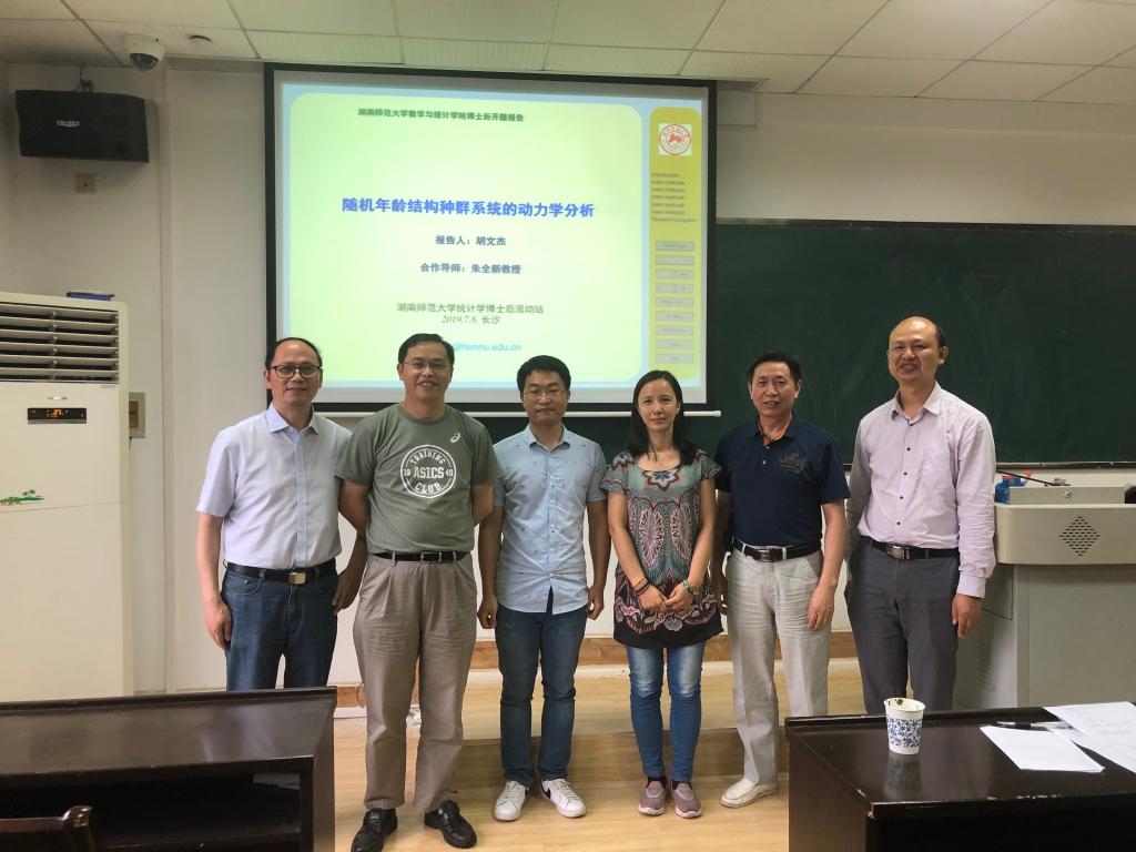 2019年7月8日下午,我院在学院302教室举行统计学博士后胡文杰开题报告会。会议由太阳成集团tyc朱全新教授主持。湖南大学数学与计量经济学院副教授、博士生导师舒小保,太阳成集团tyc太阳成集团tyc郭水霞教授、刘万荣教授和文有为教授作为专家评委参加了此次报告会。