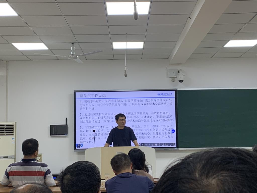 院长李利平教授做学院新学期工作报告。报告围绕欢迎新入职教师、回顾学院2022年以来所做的主要工作、学院当前主要问题、新学年的工作计划四个方面。他指出要加强思想道德、学风和学术道德建设;加强高层次人才引进力度,持续引进专任教师;稳定和壮大教师队伍,优化青年教师成长环境;明确学科定位,优化学科布局,彰显学科特色;持续改进学院教学、科研、办公环境,推动学院事业发展再上新台阶。