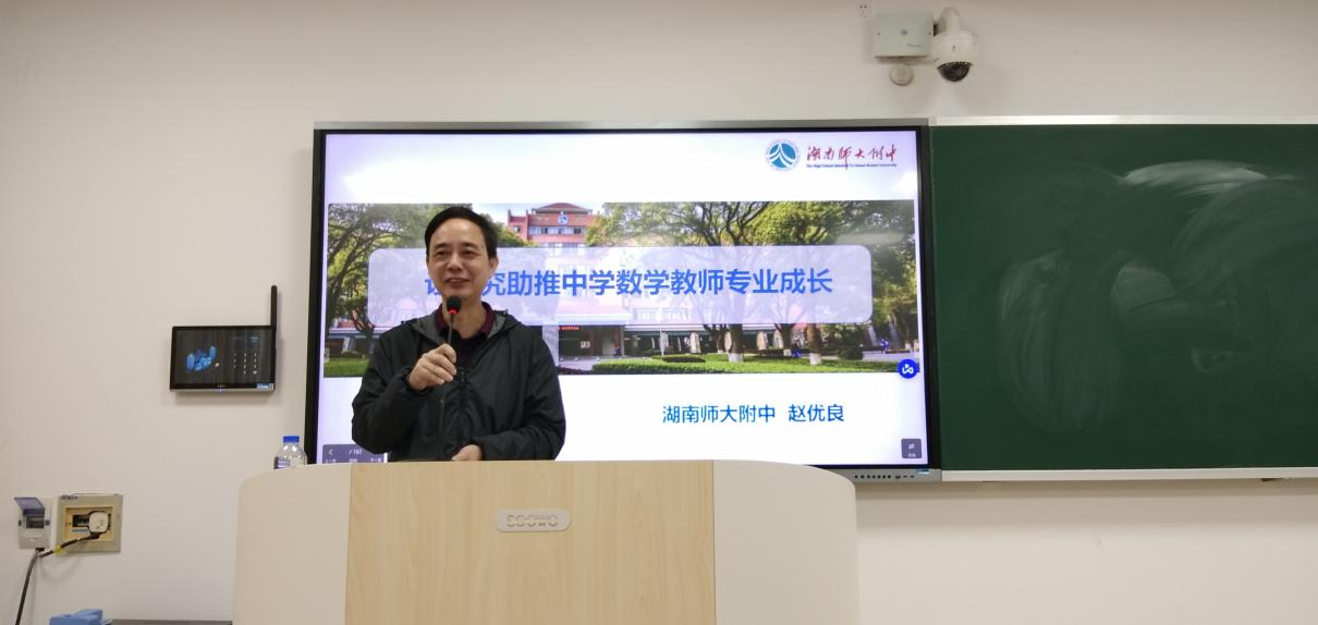 (通讯员:蒋培杰)2022年11月21日上午,长沙市中学数学名师工作室首席名师、太阳成集团tyc附属中学赵优良特级教师做客太阳成集团tyc《教育研习》课程,在理学院409学术报告厅进行了一场主题为“让研究助推中学数学教师专业成长”的讲座。讲座由数学教育教研室主任蒋培杰主持,数学系副主任袁智强出席并做总结发言。数学与应用数学专业2019级全体师范生以及数学教育方向部分研究生约200人以线上线下融合的方式参加了会议。