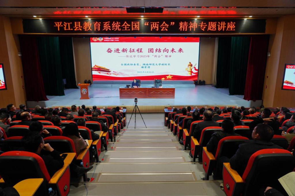 (供稿 颐华学校)3月21日,平江县教育系统全国“两会”精神专题讲座在颐华学校举行,第十四届全国政协委员、我校副校长谢资清受邀作专题宣讲。平江县人民政府办公室副主任王永祥主持宣讲会。